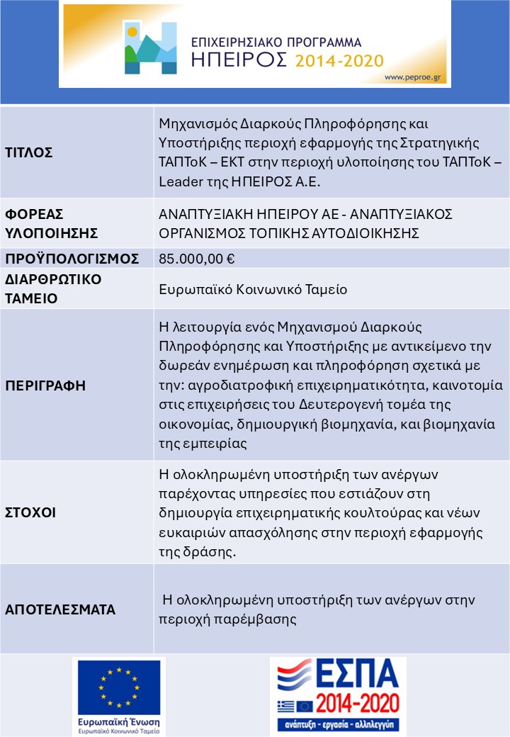 Μηχανισμός Διαρκούς Πληροφόρησης και Υποστήριξης περιοχή εφαρμογής της Στρατηγικής ΤΑΠΤοΚ – ΕΚΤ στην περιοχή υλοποίησης του ΤΑΠΤοΚ – Leader της ΗΠΕΙΡΟΣ Α.Ε.